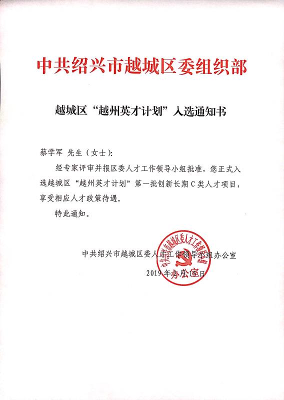 2月15日,越城区人才办发布了“越州英才计划”第一批入选通知,我公司总工程师蔡学军入选为第一批“越州英才计划”人才项目!