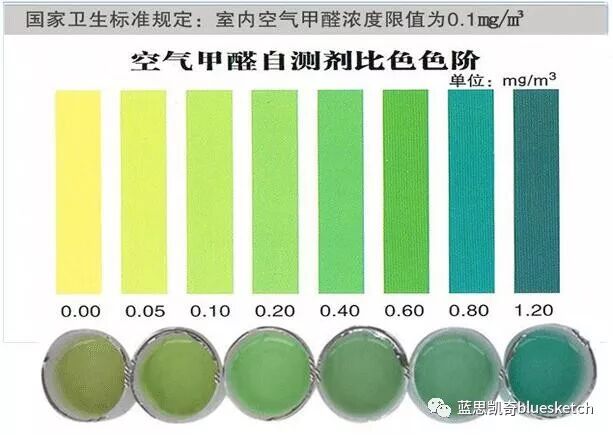 甲醛自测盒是一种通过色彩来表现甲醛含量的自我测试产物,对遭到甲醛污染的室内环境进行快速半定量体验,从而达到对甲醛污染程度的一个判定。自测盒的检测原理,类似于ph试纸。我们通过对色彩的对比从而获得一个甲醛的分数。如果测试的液体出现蓝色,就是超标。颜色越深甲醛含量越浓。