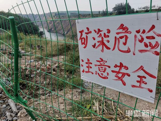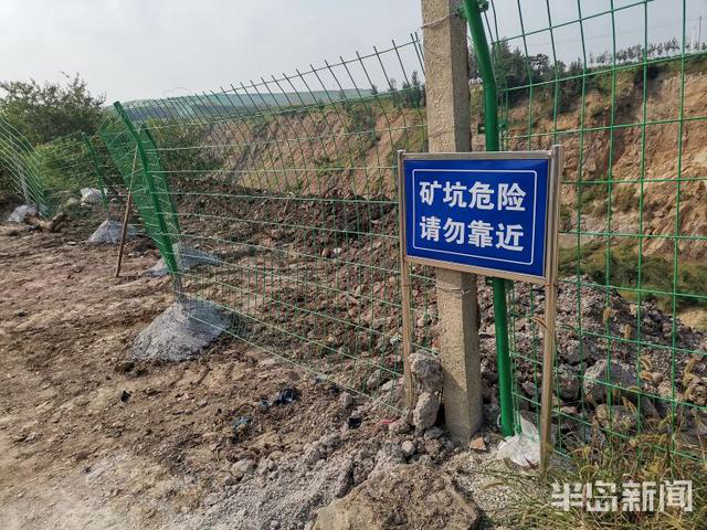 为了防止意外发生,大坑周围围了一圈一人多高的绿色铁丝网。在靠近村民房屋一侧,记者发现有两段铁丝网是刚刚安装的,底座的水泥尚未完全干透。铁丝网上还挂有一块“矿坑危险请勿靠近”的警示牌。