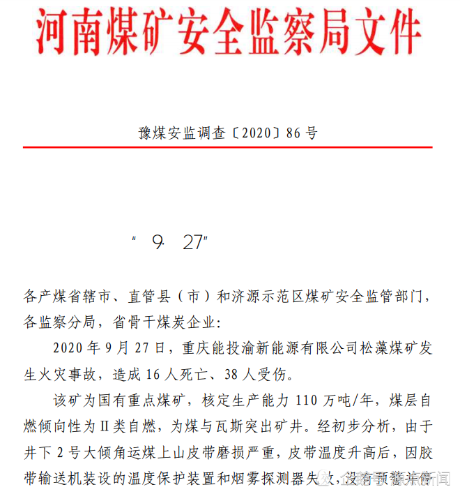 9月28日下午3:41,河南煤矿安全监察局官网发布消息称,重庆松藻煤矿井下发生火灾事故,皮带起火引发煤炭燃烧,产生有毒有害气体致人中毒,造成16人死亡38人受伤。