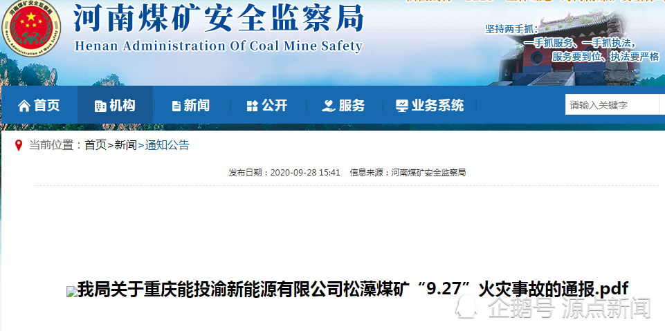 记者查询发现,河南煤矿安全监察局官网在首页“政务公开”的“通知公告”栏中发布该局关于重庆能投渝新能源有限公司松藻煤矿“9.27”火灾事故的通报。