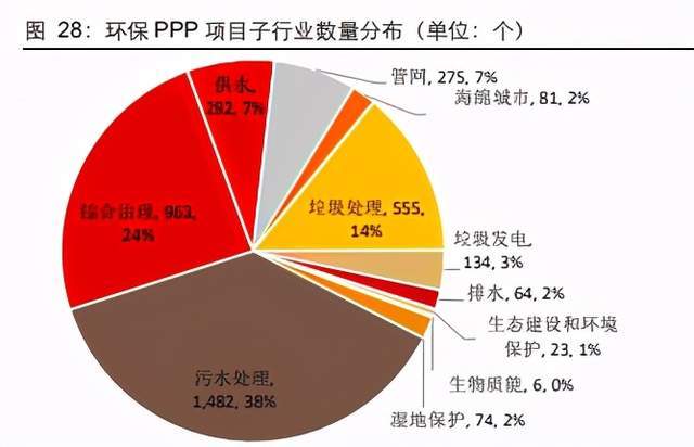 目前环保领域细分行业在库项目按投资金额来看,主要集中在综合治理和污水处理领域, 分别涉及总投资 1.05 万亿元和 0.6 万亿元,占比分别为 38%、22%。此外管网、垃圾 处理和供水等方向投资额也较多。