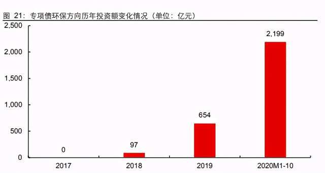 截至 2020 年 10 月底,全国一般地方政府新增专项债共 3.55 万亿元,其中明确用于环 保方向的专项债发行总规模约 2,199 亿元,占比 6.2%。其中生态环保 1,660 亿元(占 比 4.7%)、水务 263 亿元(占比 0.7%)、水污染治理 185 亿元(占比 0.5%)、污水处 理 93 亿元(占比 0.5%)。扣除其他综合类投向的专项债后,环保方向专项债总规模占 比 8.1%,远高于 2019 年的 3.0%,规模已经是 2019 年 654 亿的 3.36 倍。