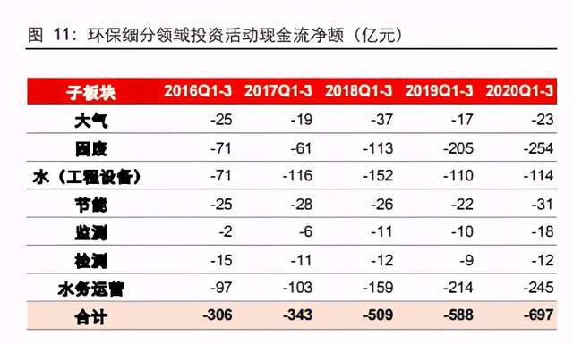 固废、水务子板块作为环保行业的主体(2020Q1-Q3 营收占比分别为 42.2%/19.9%, 归母净利润占比分别为 46.3%/39.3%,经营活动现金流净额占比分别为 41.2%/47.4%), 在存在疫情的影响下,其 2020Q1-Q3 归母净利润同比增速分别达 18%/25%,投资活动 现金流净额分别同比增 24%/14%,对短期业绩形成支持,同时反映行业处于成长期; 筹资活动现金流净额分别同比增 21%/63%,对中长期业绩形成支持,故业绩增长具备 续航力。