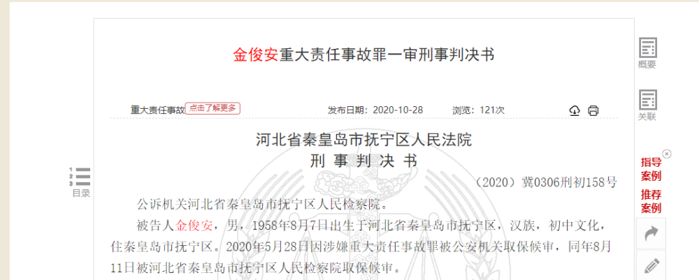近日,河北省秦皇岛市抚宁区人民法院公开该案判决书,判决书显示,被告人金俊安犯重大责任事故罪,判处有期徒刑三年,缓刑五年。