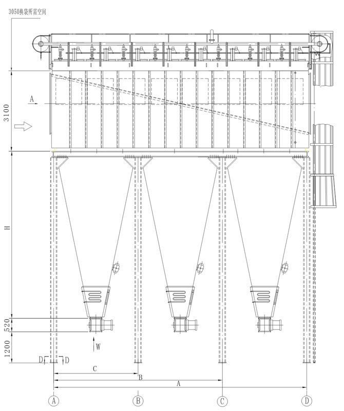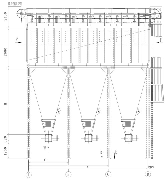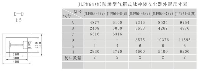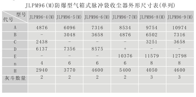 6、为降低设备灰斗高度,JLPM32-5(M)和JLPM32-6(M)采用双灰斗布置,表中H为
