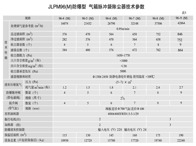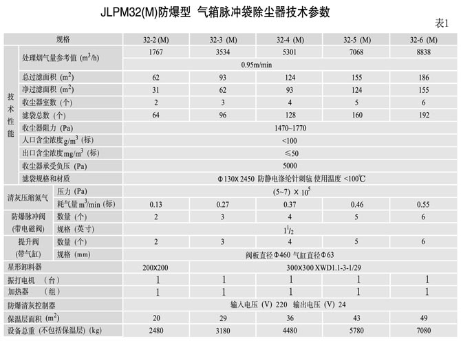 2、本系列收尘器能负压或正压操作,本体结构无任何改变,其收尘效率可达99.9%以上,净化后气体的含尘浓度小于30mg/m3 (标)。本系列收尘器的主要技术性能分别见表1、 表2、表3和表4。
