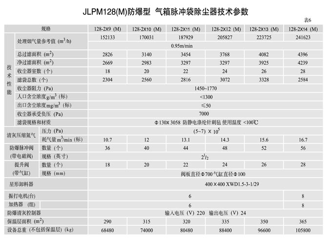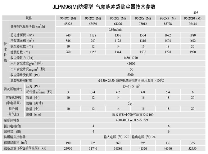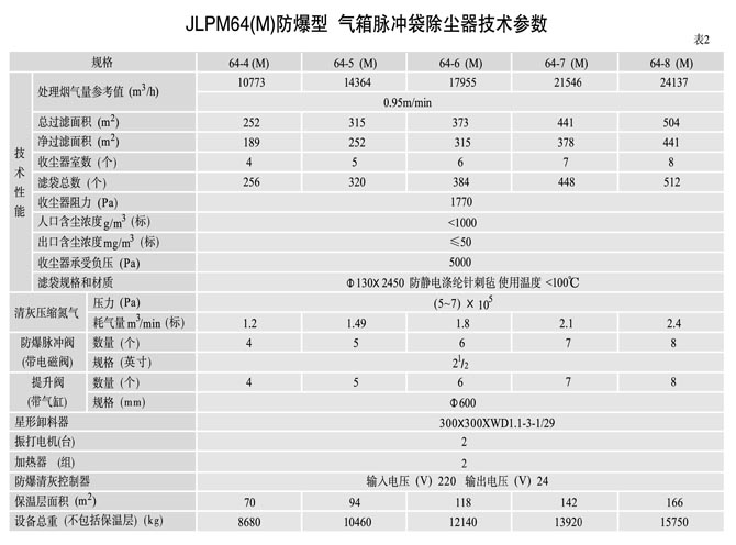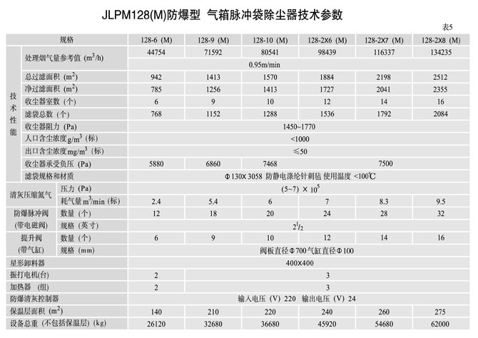 2、根据计算得出的净过滤面积,则可直接从表1、2、3、4、5中选取合适的除尘器