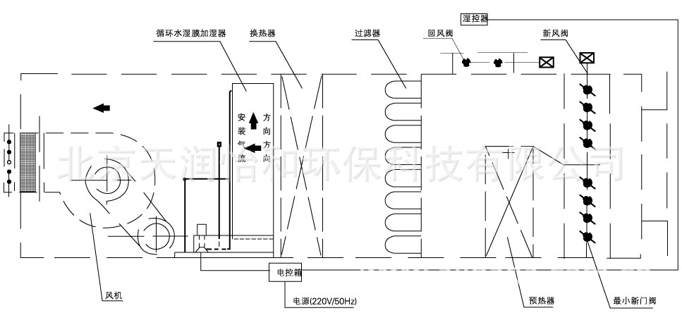 循环水湿膜加湿器的主体部分(不锈钢框架及膜体)和循环水箱(不锈钢制)安装在空调机组换热器上,电控箱安装在空调箱外壁。