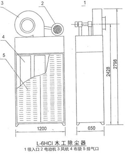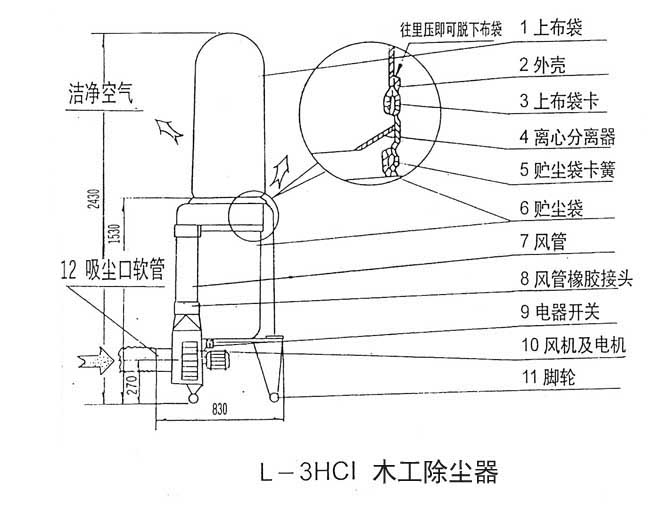 | 一、概述 L—3—120HCI系列木工除尘器是新型除尘机组,具有结构合理,性能稳定,使用及维护方便。 通过管道吸入到除尘机组内的含尘空气,大部分尘埃通过惯性落于箱内,浮的微尘经过圆筒式布袋过滤变成清洁空气,由排气排出。 二、结构 |