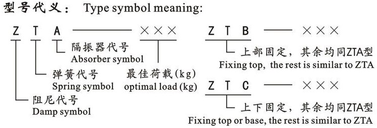 ZTA型阻尼弹簧隔振器根据安装方式不同可分为三种:1、ZTA型为上下不固定,可任意移动调节重心;2、ZTB型为上部固定形式;3、ZTC型为上下均可固定,以适合各种安装需要。