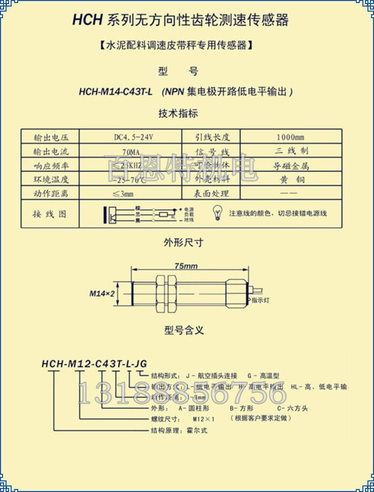 HCH齿轮传感器原理及特点:利用钢铁材料(或其他导磁材料)做的齿轮转动,产生磁通量的变化,通过故态磁敏元件获得信号,可测量齿轮的转动。特点是分辨率高,频响宽,抗干扰强,可靠性高。输出为幅度稳定的方波信号,能实现远距离传输。主要应用于将机械运动中的转动的物理量转化成方波脉冲电信号。多用于测量速度、周期和位移。广泛应用于电子调速皮带称、机械、化工、交通、自控、汽车、出租车记价器、摩托车发动机转速等各个领域。