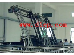 GLG型高链式格栅除污机主要由驱动装置、架体、除污耙及卸渣机构等组成。除污耙上的三角形杆架结点与链条铰结,另一结点上的滚轮位于平行于栅条的槽钢导轨中,齿耙则固定在三角形杆架的底边上,当链条由顶部的驱动装置带动后(链轮顺时针转动),齿耙架受链条和导轨的约束作平面运动,在链条运行一周内完成齿耙闭合水下取渣,上行输渣和张耙换位等循环动作,其间当齿耙上行,触及顶部的卸渣板时,在两者相对运动的作用下,将渣撇出经导渣板卸至渣桶内或输送机中。