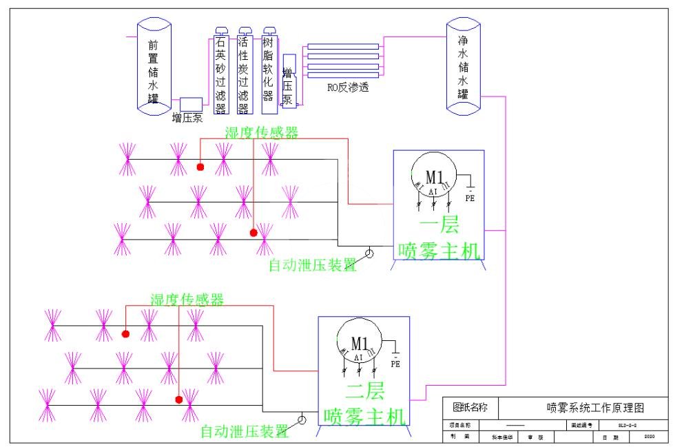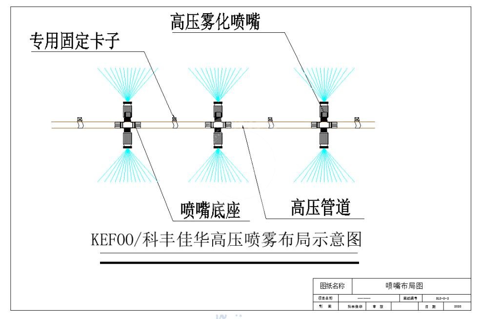 8、整体设计:喷嘴布局间距2米一个喷雾点,每个喷雾点布局2只喷嘴,单只喷嘴流量设计0.038L/min,雾滴颗粒直径设计3-8微米;