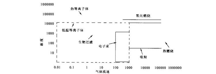由图 2 可以看出,生物过滤和燃烧技术能应用于较高浓度范围,但却受气体的流速所限;电子束照射技术仅有一段非常窄的流速范围。而低温等离子技术对气体的流速和浓度都有一个很宽的应用范围,其应用广泛不言而喻。