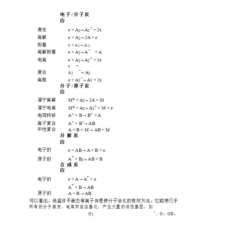 等离子体中的化学反应主要是通过气体放电产生的快电子激发来完成的。这些快电子与气体分子碰撞,使气体分子激发到更高的能级。被激发到高能级的分子,由于其内能的增加,既可发生键的断裂也可以与其它物种发生化学反应;而由于碰撞失去部分能量的电子在电场的作用下仍可得到补偿。典型的反应类型如下: