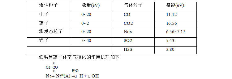 (2)等离子体中包含了大量的高能电子、离子、激发态粒子(其能量范围如表 1)和具有强氧化活性的自由基,这些活性粒子的平均能量高于气体分子的键能,它们和有害气体分子发生频繁的碰撞,打开气体分子的化学键,同时产生的大量??OH、HO2?? 、O??等自由基和氧化性极强的 O3 跟有害气体分子发生化学反应生成无害产物。