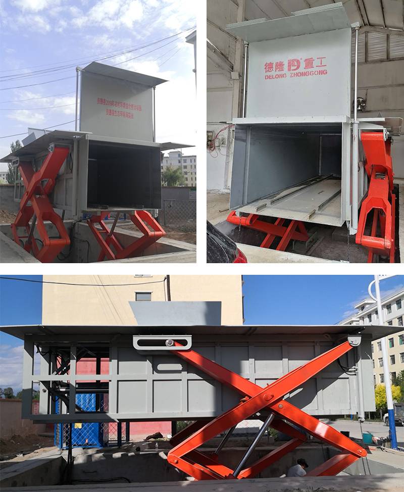 地埋式垃圾中转站设备的举升绞架可将垃圾压缩设备的整体上升致地面以上,与垃圾转运车辆对接,地埋式垃圾站加长了垃圾箱的箱体,可有效防止垃圾在装车过程中掉落基坑;待垃圾裝车完成后,垃圾压缩站落入地坑,等待下一循环。