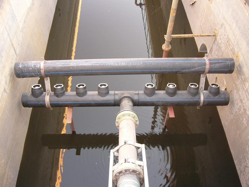 该型滗水器的原理结构同PA(QA)型,但它整体呈“T”形结构,布置在水池的一端。主要适用于连续进水的SBR工艺,如DAT-IAT、ICEAS等工艺。该型滗水器又有两种形式:与传统浮筒式滗水器相似的结构(如附图所示);另一种采用肘拐旋臂结构,无须设池底支架,适合于对传统浮筒滗水器的改造。