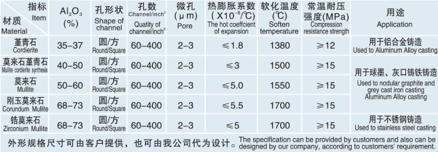 我公司针对国内外铸造行业使用直通式过滤片所存在的问题,采用特殊的配方和工艺,从提高过滤片的抗热冲击性能、高温强度、孔隙率和比表面积等方面出发,设计制造出的过滤片多项性能指标达到或超过国外产品水平,能够最大限度地过滤和吸附金属液中尽可能小的夹杂物,防止气泡进入,有效地减少金属液的紊流,进而达到金属液的均质化,并可涂附各种催化剂,在过滤杂质的同时完成相应的化学反应,提高铸件质量。